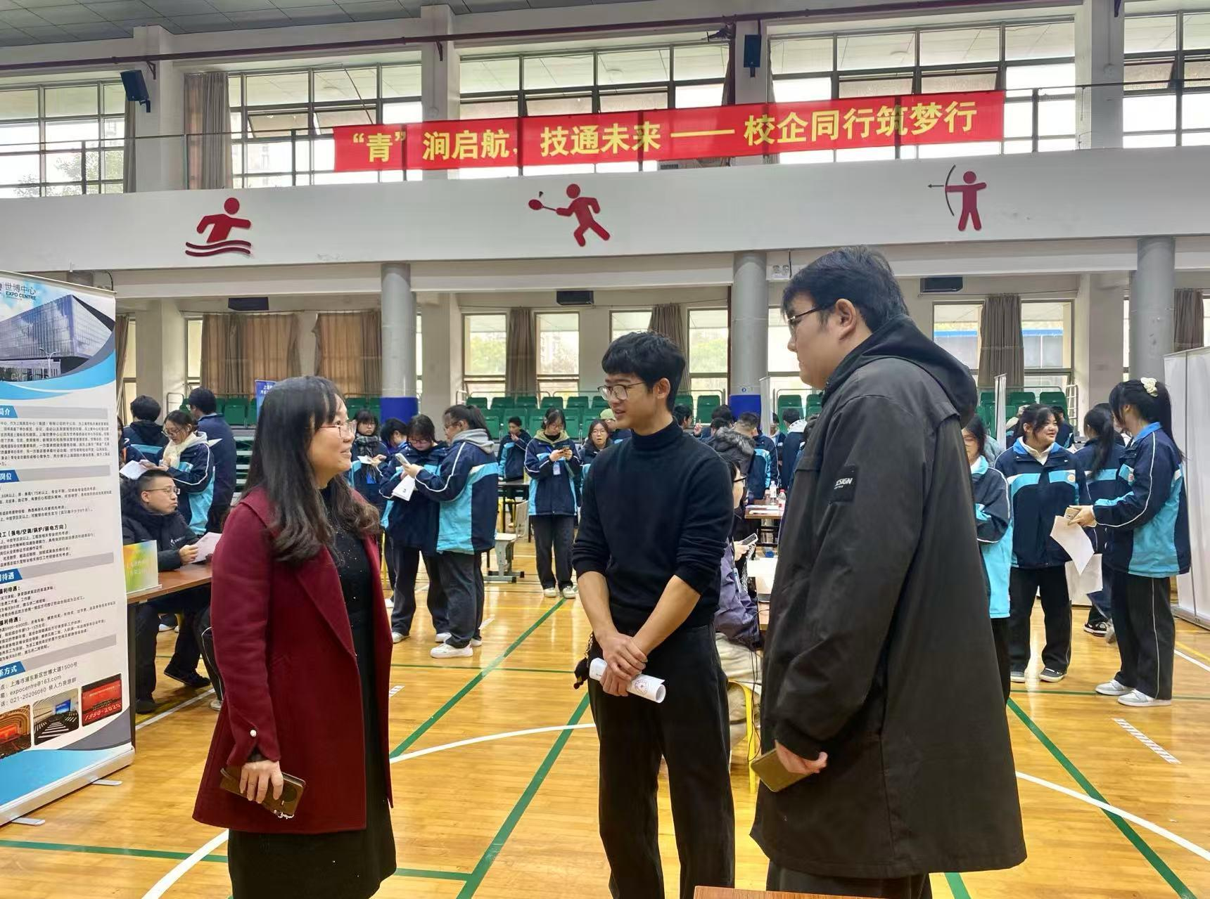 2025年12月23日,上海市曹杨职业技术学校体育馆内人头攒动,一场以“‘青’润启航 技通未来”为主题的2025年校园招聘会在此举行。这场招聘会不仅是校企对接的“双向奔赴”,更是曹杨职校践行职业教育理念、服务学生成长的生动实践,为270余名学生提供了520余个实习岗位,覆盖旅游服务、商贸会展、工程技术三大专业部,60余家行业企业参与其中,为学子们搭建起从校园到职场的桥梁。